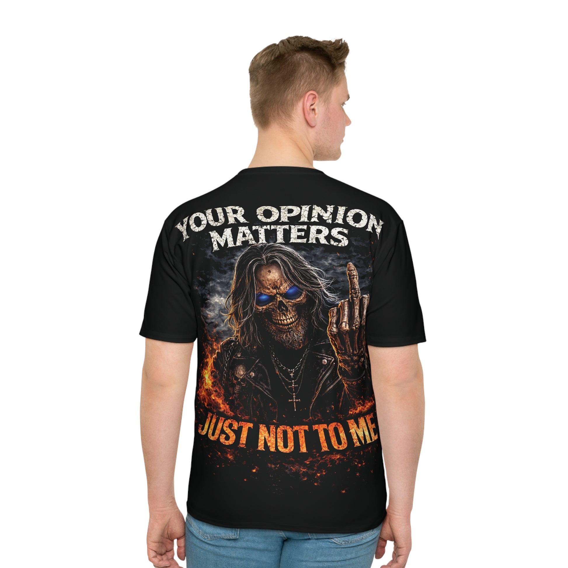 This heavyweight-feel all-over print tee brings a dark, rebellious energy to everyday wear. A snarling skull-faced rocker stares from the back, sunglasses glinting amid embers and smoke, while bold distressed lettering reads “Your Opinion Matters — Just Not To Me.” The front bears a small, gritty emblem over the heart for understated attitude. Lightweight and stretchy, the shirt drapes easily and moves with you — good for late-night rides, loud shows, or afternoons when you want your mood to speak before you do.